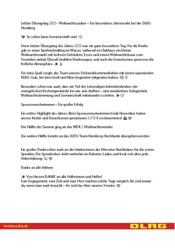 Die DLRG ist ein gemeinnütziger Verein und finanziert sich über Spenden und Mitgliedsbeiträge. „Da freuen wir uns über jeden Cent, der die Schwimmausbildung und den Rettungssport immer mittwochs im Kombibad Homberg unterstützt“, so Heike Oppenberg.