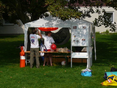 Wir zeigten uns mit einem Informationsstand an dem wir nicht nur Broschüren verteilten, sondern auch ein Baderegelquiz veranstalteten. Außerdem stellten wir einige Rettungs- und Übungsgeräte zum Testen zur Verfügung. So waren viele begeisterte Flossenschwimmer im Wasser, einige übten sich im Retten unser Übungspuppen, schleppten sich gegenseitig mit dem Gurtretter und der Rettungsboje oder probierten sich im Werfen des Rettungsballes. Highlight war hier mal wieder das sich "Retten lassen" mit dem Rettungsball oder der Rettungsleine. Wir warfen den Kids den Ball zu und zogen sie so an Land.