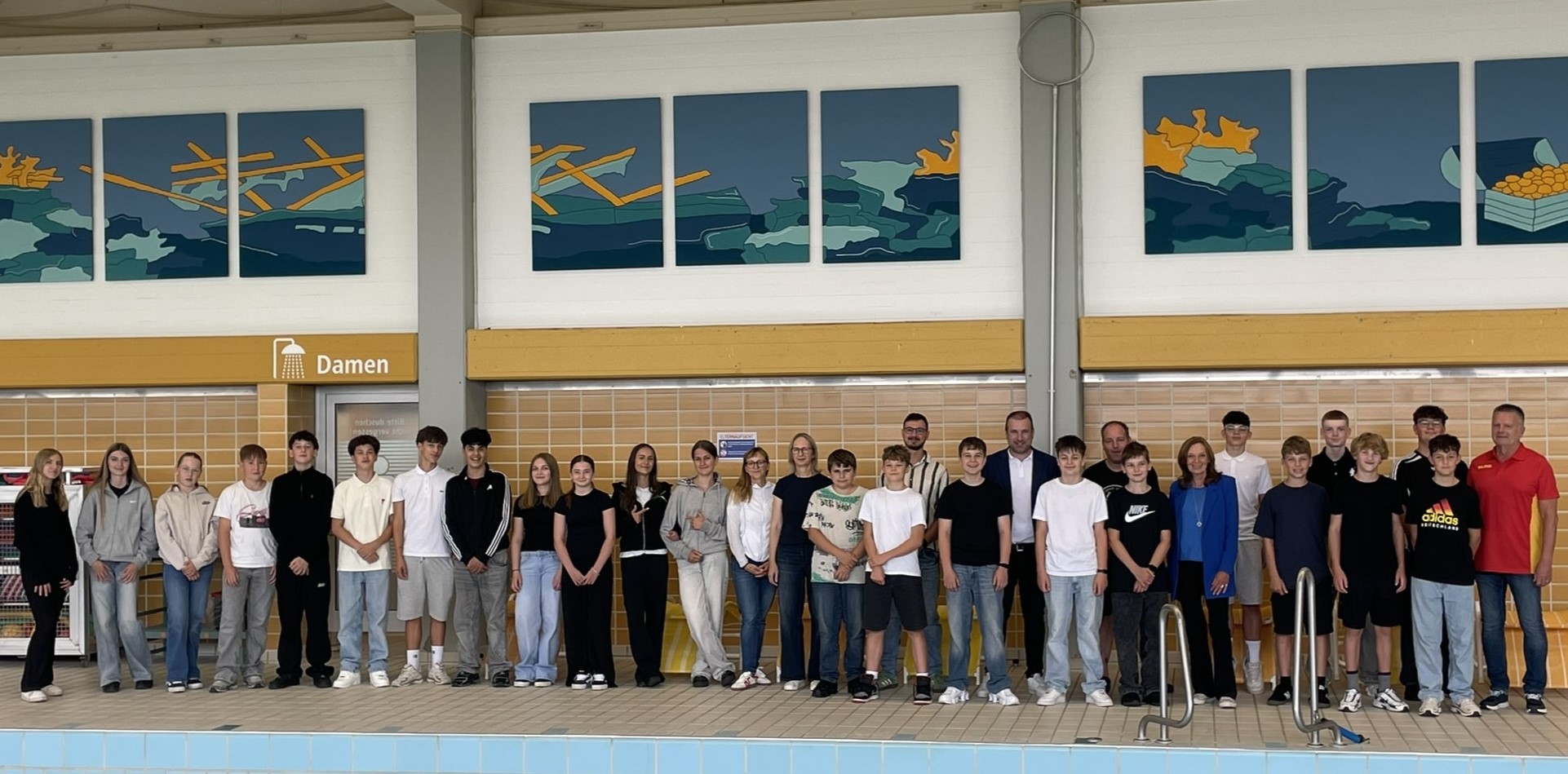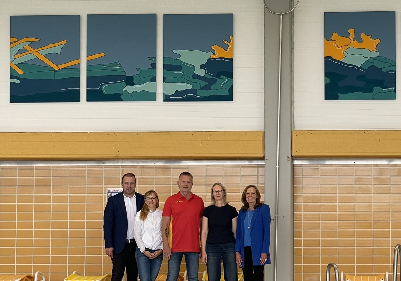Jeder Schüler der Klasse 7B, die beiden Kunstlehrkräfte sowie die DLRG wirkten aktiv mit – ein beeindruckendes Beispiel dafür, wie aus kleinen Ideen etwas Großes entstehen kann. Das Kunstwerk wird das Schwimmbad in Schonungen über viele Jahre prägen und alle Beteiligten stets an die erfolgreiche Kooperation erinnern.