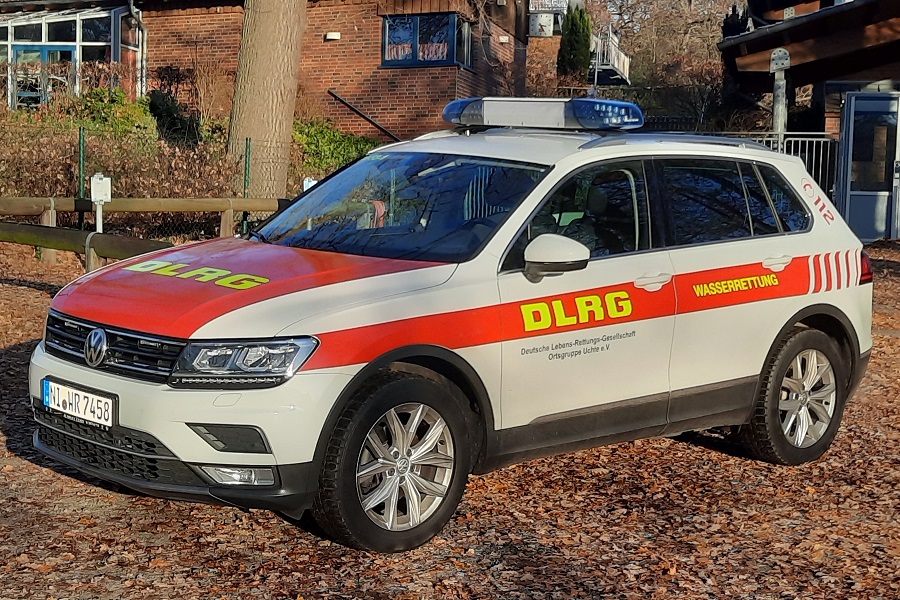 Die Beschaffung 2022 ging fast zeitgleich mit dem Kauf des MZB einher. Der gebrauchte Tiguan wurde in Eigenleistung mit Sondersignalanlage und Funk ausgestattet und dient den Einsatzkräften als Zugfahrzeug des Hochwasserrettungsbootes. Finanziert wurde der GW Wasserrettung zur Hälfte durch Eigenmittel und zur anderen durch öffentliche Zuschüsse und Spenden. Mit seinem Allradantrieb ist er ideal zum Trailern und Slippen der Uchte I und Transport von Einsatzmaterial wie Notfallrucksack, Rettungswesten usw. Zudem steht er den Ausbildern für Fahrten zum Schwimmtraining zur Verfügung und auch beim ZWRD-K und bei Jugendfreizeiten kommt er zum Einsatz.