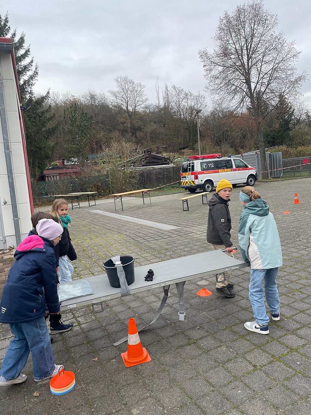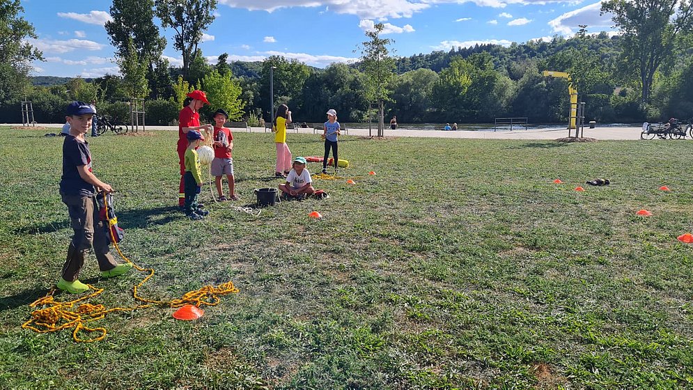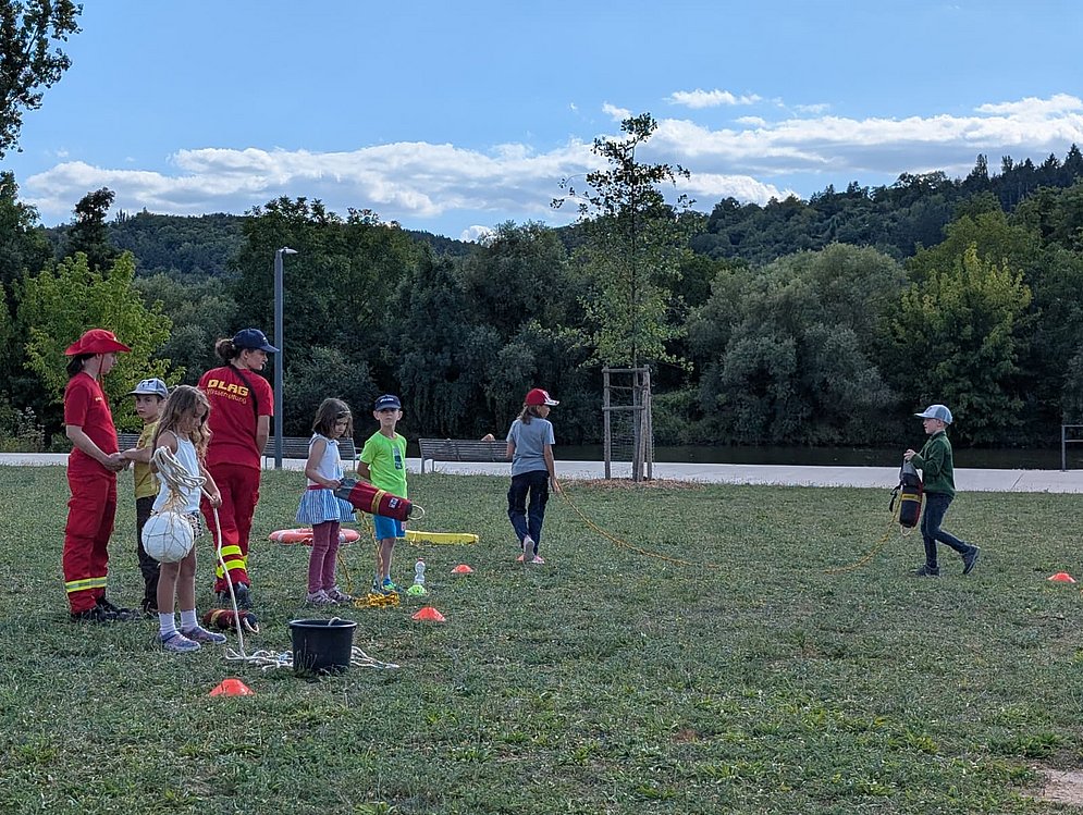 An der ersten Station lernten die Teilnehmer*innen verschiedene Knoten kennen. Der ein oder andere Knoten war doch schon schwierig, aber alle haben diese Aufgabe mit Bravour gemeistert. Jetzt weiß jeder, wie man ein Boot anbindet, ohne dass es alleine davonschwimmt. Die zweite Station beinhaltete „leichte Erste Hilfe“. Hierbei lernten die Kinder, wie man eine Rettungsgasse bildet und wie man Verbände anlegt. Natürlich wurde das auch gleich geübt! Das Highlight war zweifellos die Einführung in die Autos und die Boote. Die Teilnehmer*innen erfuhren, wo sich beispielsweise die Funkgeräte in den Autos befinden und wie das Blaulicht angeht. Natürlich durfte dabei unser neues Hochwasserboot nicht fehlen! Zwischendurch spielten wir noch ein paar Spiele, um etwas Abwechslung zu bekommen.