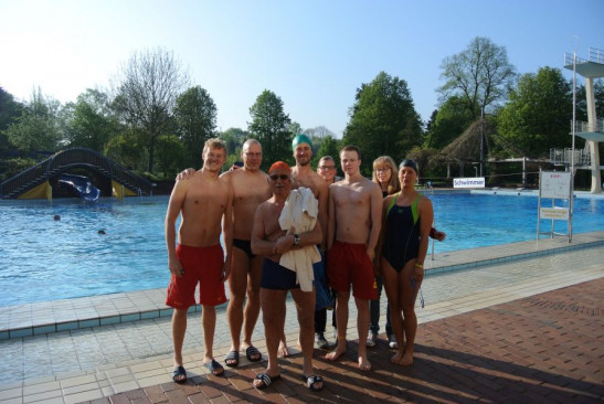 Wenn man eines Sonntagmorgens um 8 Uhr draußen auf das Thermometer schaut und einem von dort eine frostige 6 entgegen lächelt, denkt wohl kaum einer "Los! Ab ins Freibad!". Dennoch folgten am 1. Mai mit Christian Plagge, Charlotte Hoffmann, Peer-Ole Ahlers und Philip Gerstel gleich 4 tapfere Schwimmer unserer Ortsgruppe der Einladung der Stadtbad GmbH und zogen so, als eine der ersten in dieser Saison, ihre Runden im Freibad Bürgerpark. Nach einer kurzen Trainingseinheit ging es dann jedoch zügig unter die warme Dusche, denn obwohl das Wasser mit knapp 18°C deutlich wärmer war als die Luft, braucht es wohl noch ein wenig Sonnenkraft, bis man sich draußen im Wasser wieder so richtig wohl fühlt. Für die ganz Harten hat das Freibad im B& ... Mehr erfahren