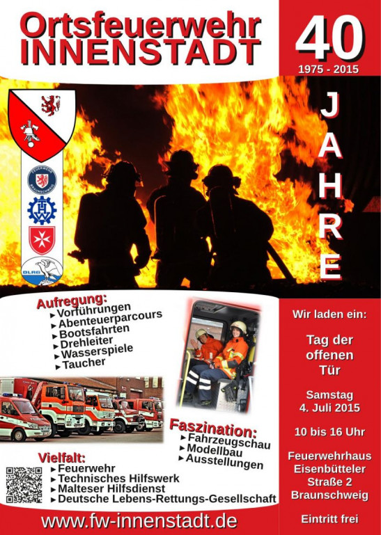 Anlässlich ihres 40. Jubiläums lädt die Freiwilligen Feuerwehr Innenstadt am 4. Juli von 10 bis 16 Uhr zu einem großen Tag der offenen Tür an das Feuerwehrhaus an der Eisenbütller Straße. Zu Gast sind auch andere Rettungs- und Hilfsorganisationen und da dürfen wir natürlich nicht fehlen! Neben der Freiwilligen Feuerwehr werden das Technische Hilfswerk, der Malteser Hilfsdienst und wir mit von der Partie sein, sodass wir gemeinsam ein spannendes und attraktives Programm bieten können. Auch für die Kleinsten ist etwas dabei: Ein organisationsübergreifender Abenteuer-Parcours wartet auf euch! Also kommt vorbei und erhascht einen Blick hinter die Kulissen der Lebensretter! ... Mehr erfahren