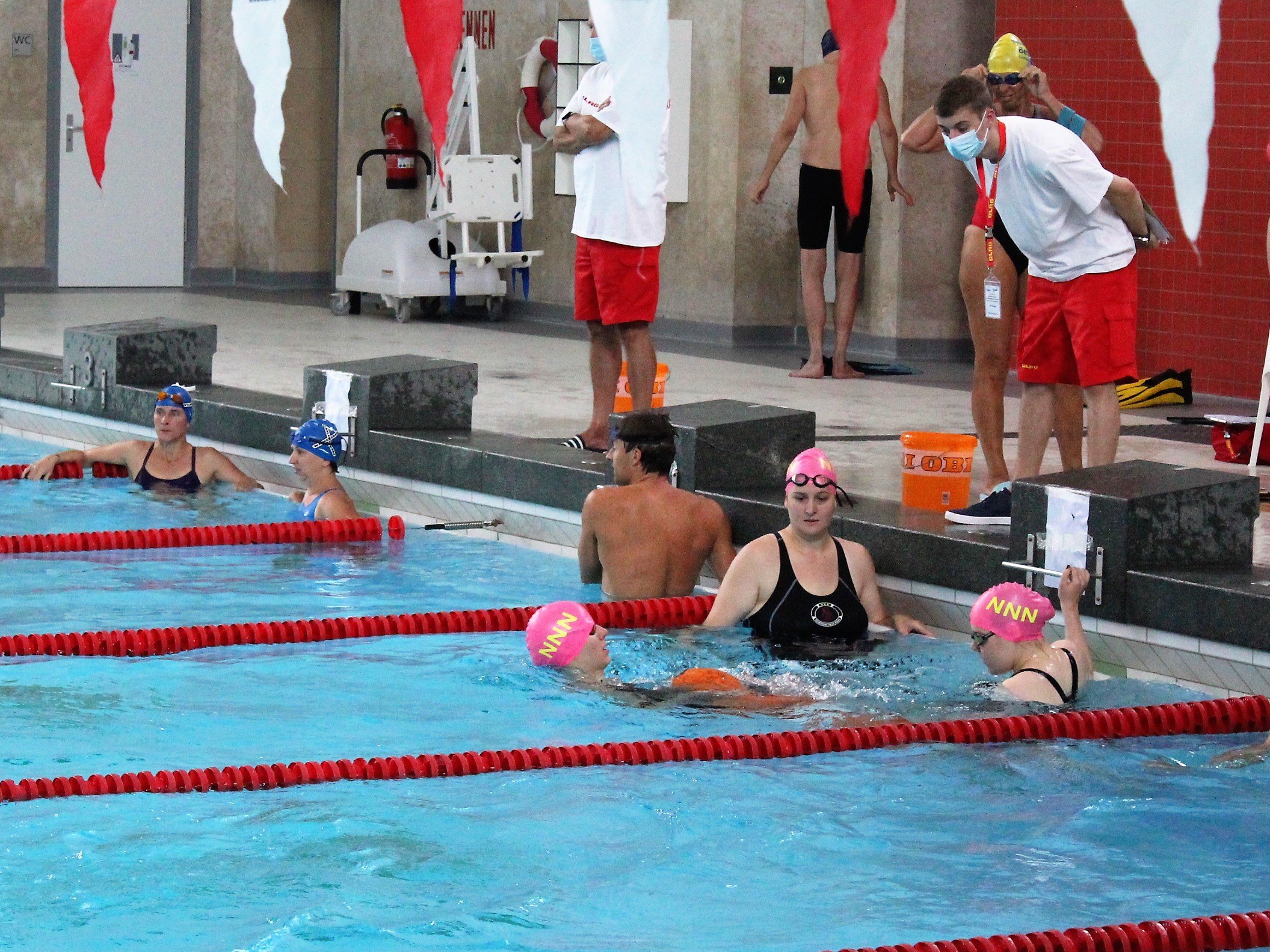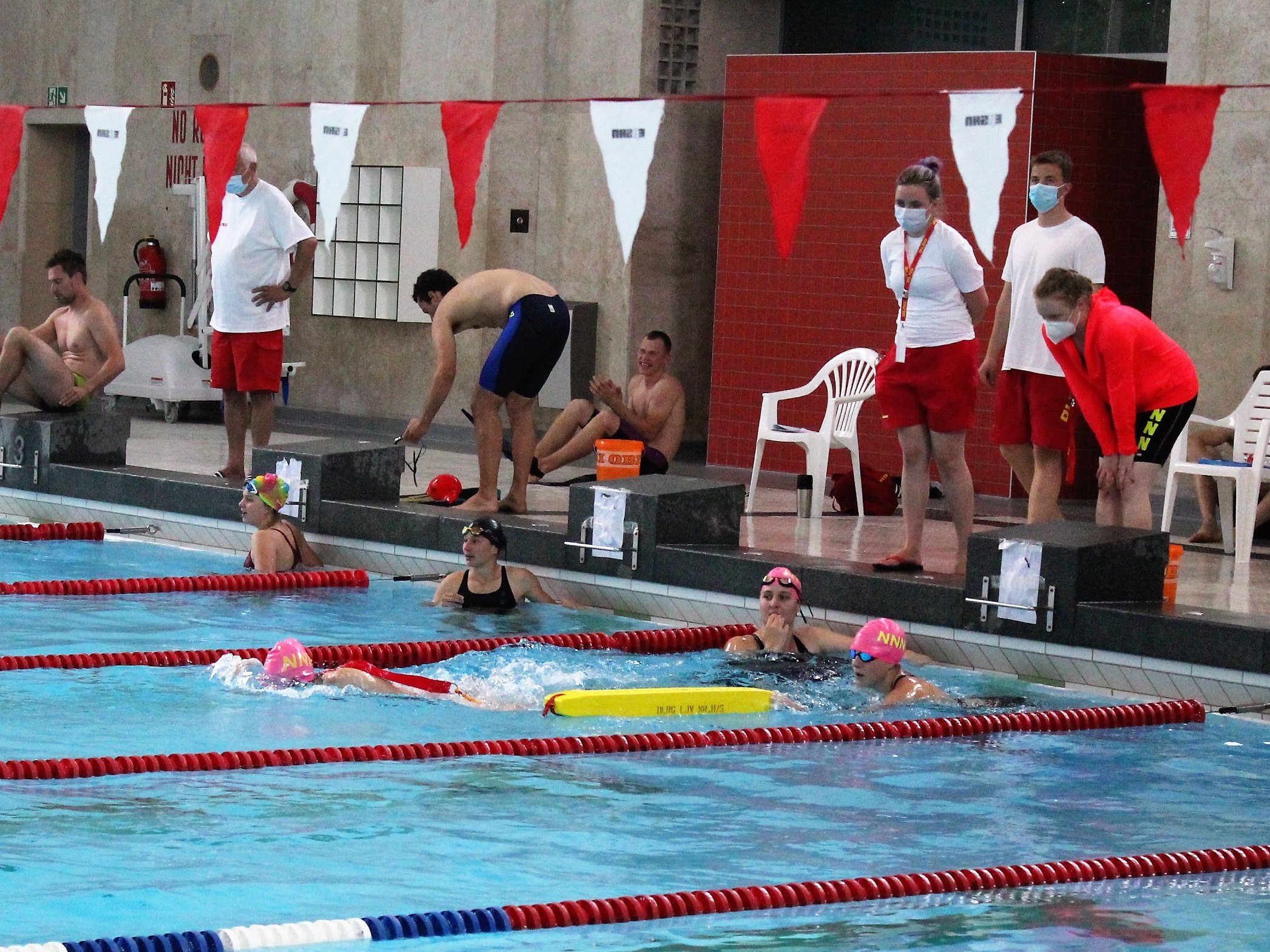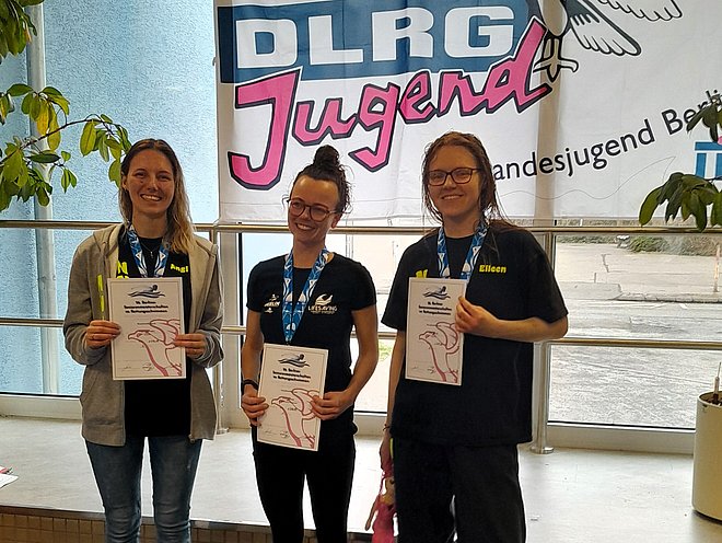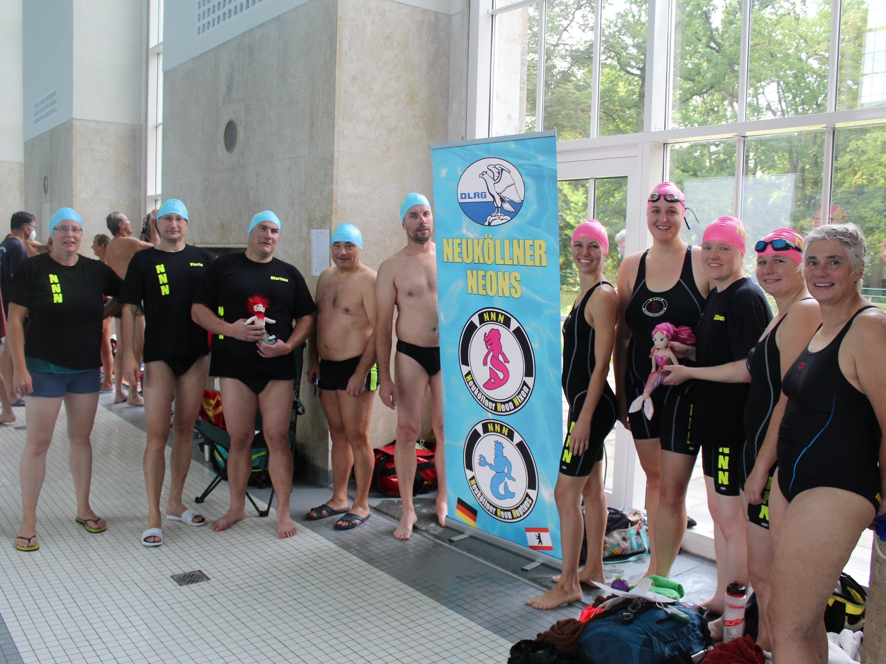 Mit drei Mannschaften gingen wir dann am 29. August an den Start. Vormittags waren zunächst die Senioren*innen an der Reihe. Die Neuköllner Neon Nixen und Neptuns, kurz NNNs, stellten zwei Mannschaften in den Altersklassen 100 w und 170 m. Die anfängliche Nervosität nach fast zwei Jahren Wettkampfpause legte sich schnell nach der 1. Staffel, der Puppenstaffel, die beide Mannschaften fehlerfrei absolvierten. Es folgten die Gurtretter- und die Rettungsstaffel, bei denen alle Starter*innen unterschiedliche Disziplinen schwimmen. Nach der zum Schluss geschwommen Hindernisstaffel konnte sich die AK 100 w über den 1. Platz und die AK 170 m über den 2 .Platz freuen.