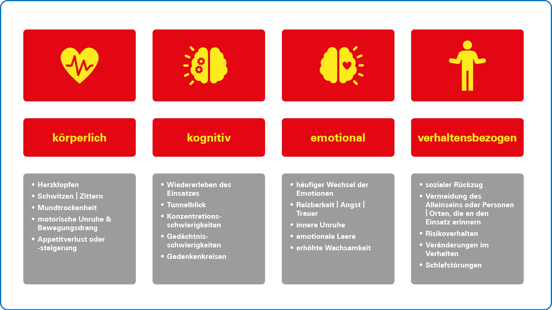 Emotionale und körperliche Überforderungen sind normale Reaktionen sind eine normale Reaktion auf ein unnormales Ereignis. Sie klingen in der Regel innerhalb weniger Tage bis Wochen wieder ab. Diesen Prozess kann man durch ein aktives Stressmanagement (Auseinandersetzen und Ablenken) selbst unterstützen.