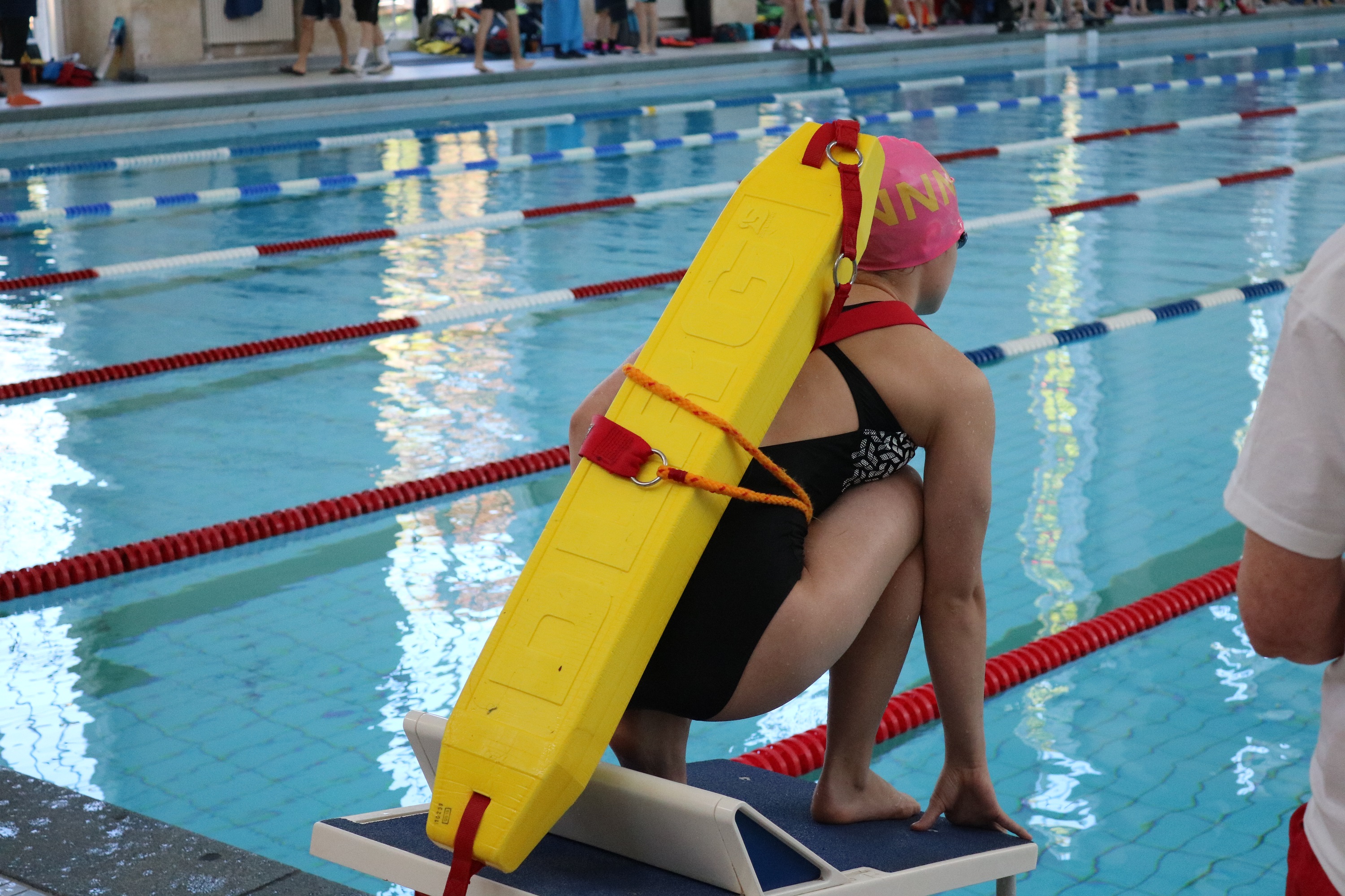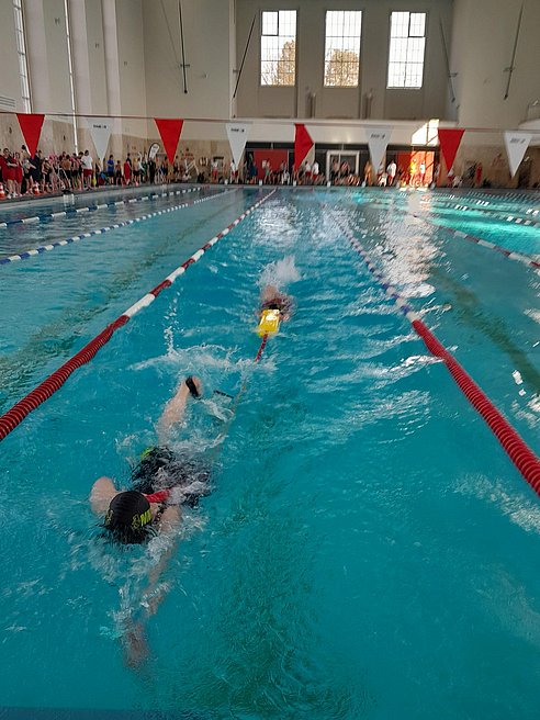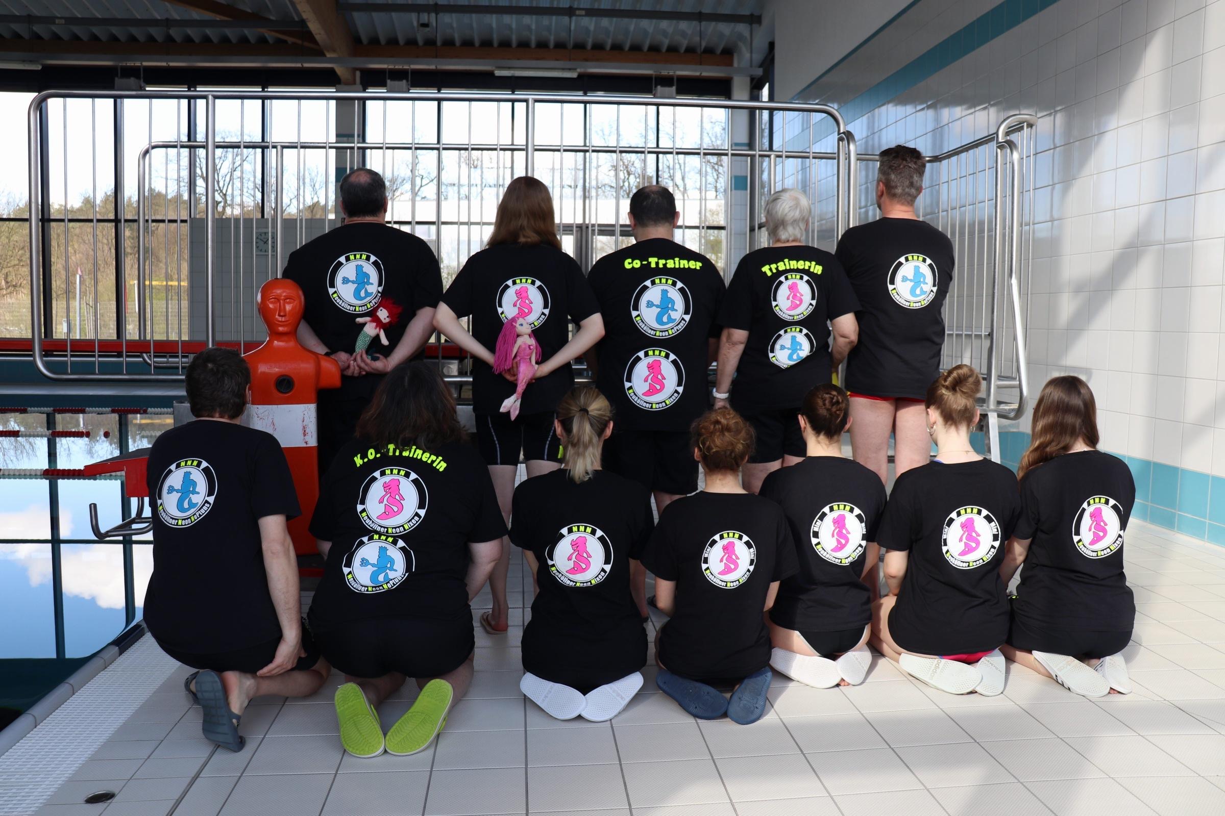 Auch, wenn die Feier im Trockenen und nur bei etwas Nass von oben stattfand, wollten sie es sich nicht nehmen lassen das Jubiläum mit einem kleinen Wettkampf zu feiern. Die Teams wurden durch Lose ermittelt, damit sich die einzelnen Mannschaften untereinander durchmischten. Dann begann der Mini-Wettkampf mit sechs Teams bestehend aus je drei Personen. Es wurde über Hindernisse mit Schwimmzubehör „geschwommen", mit Brettern auf Rollen wurde eine Rettungsleinenstaffel nachgestellt, zwischen die Beine geklemmte Poolnudeln mussten ohne Hände transportiert und übergeben werden und die Teamfähigkeit wurde mit Partnerski getestet. Natürlich wurden Zeiten genommen, sodass ein Siegerteam ermittelt werden konnte. Der Spaß und die Freude standen jedoch stets im Vordergrund und es wurde während des Durchführens wie auch beim Zuschauen viel gelacht. Bei der Schlussauswertung ergab sich dann, dass sogar gleich zwei Teams mit Punktgleichstand gewonnen hatten. Der Preis war der erste Gang ans Buffet, welches durch mitgebrachte Speisen reich gefüllt war.