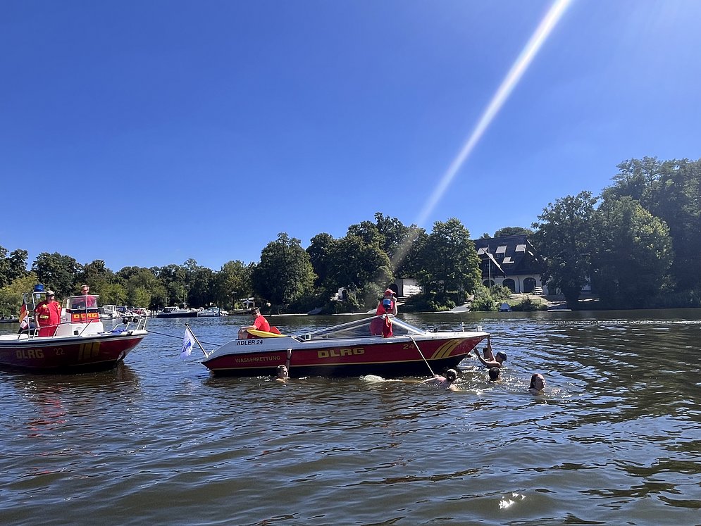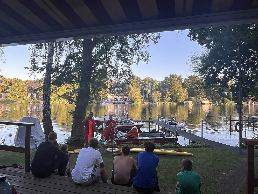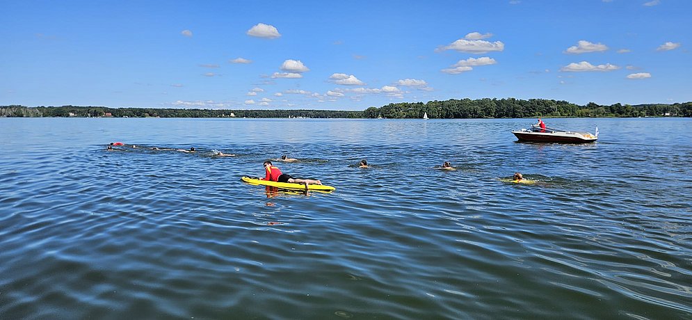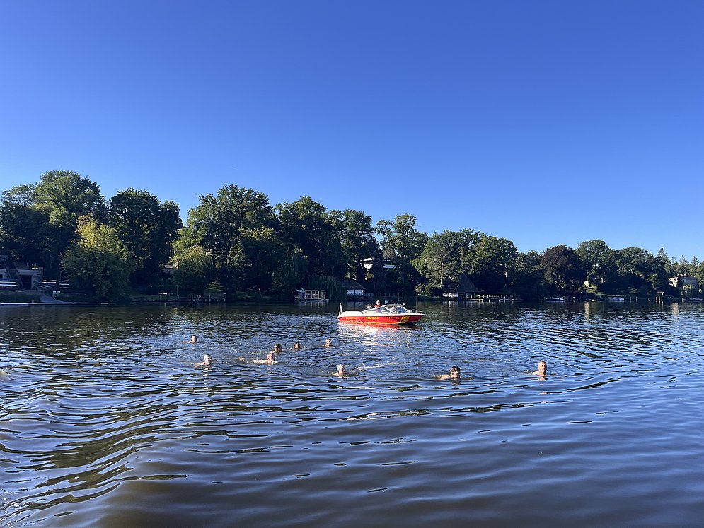 Ganz nebenbei bringen unsere Rettungsschwimmer:innen, den Teilnehmenden auch den Wasserrettungsdienst näher. Denn wenn nicht gerade geschwommen wird, zeigen wir gerne, wie toll es sich mit einem Rettungsboot fährt. Dazu gehört auch das Funken, das Anlegen am Steg und der ein oder andere Einsatz.