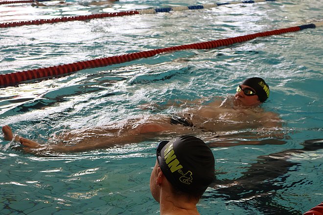 Die Zeit verging wie im Flug! Um 8.15 Uhr standen wir noch recht entspannt vor den Toren, doch sobald wir in der Halle waren und uns einschwimmen konnten, stieg die Nervosität. Die erste Disziplin musste bewältigt werden, das hieß also volle Konzentration und Teamgeist zeigen. Immer dabei: unser Maskottchen "Nixie". Die Aufregung war schwierig in den Griff zu bekommen, denn es war unser erster großer Wettkampf.