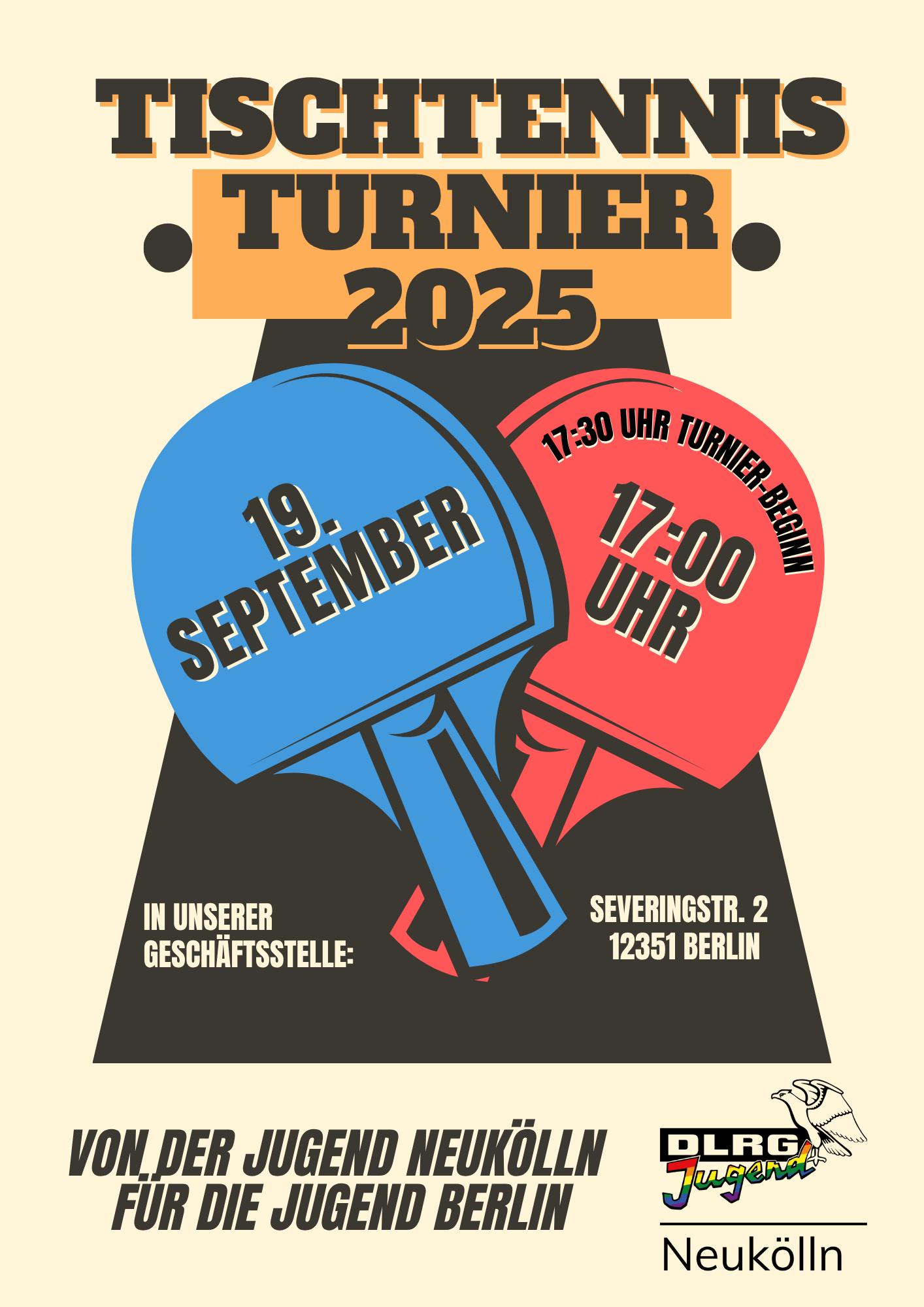 Am 19.09.2025 fand zum ersten Mal in unserer Geschäftsstelle ein Tischtennis-Turnier statt. Gemeinsam mit der DLRG Jugend Neukölln und der DLRG Jugend Berlin haben wir fleißig gespielt, Spaß gehabt und um die Krone gekämpft. Denn natürlich durfte bei unserem Turnier eine Siegerehrung nicht fehlen! Wir hatten eine Menge Spaß und ganz bestimmt ist dies der Anfang für viele weitere Turniere!