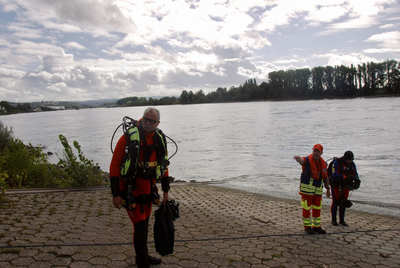 Geübt wurden unterschiedliche Szenarien, die im Ernstfall jederzeit eintreten können: Bootstrupps mussten technische Probleme meistern und trotzdem Rettungsmanöver fahren, Taucher suchten im trüben Rheinwasser nach einem verlorenen Gegenstand, und Strömungsretter wurden zu einer Notlage im Fluss alarmiert. Auch das Aufnehmen und Versorgen verletzter Personen mit Spineboard sowie das Schwimmen im Kehrwasser an den Brückenpfeilern standen auf dem Programm. Gerade dort zeigte sich, wie wichtig sichere Technik und gute Kameradschaft sind, um in der Strömung bestehen zu können.